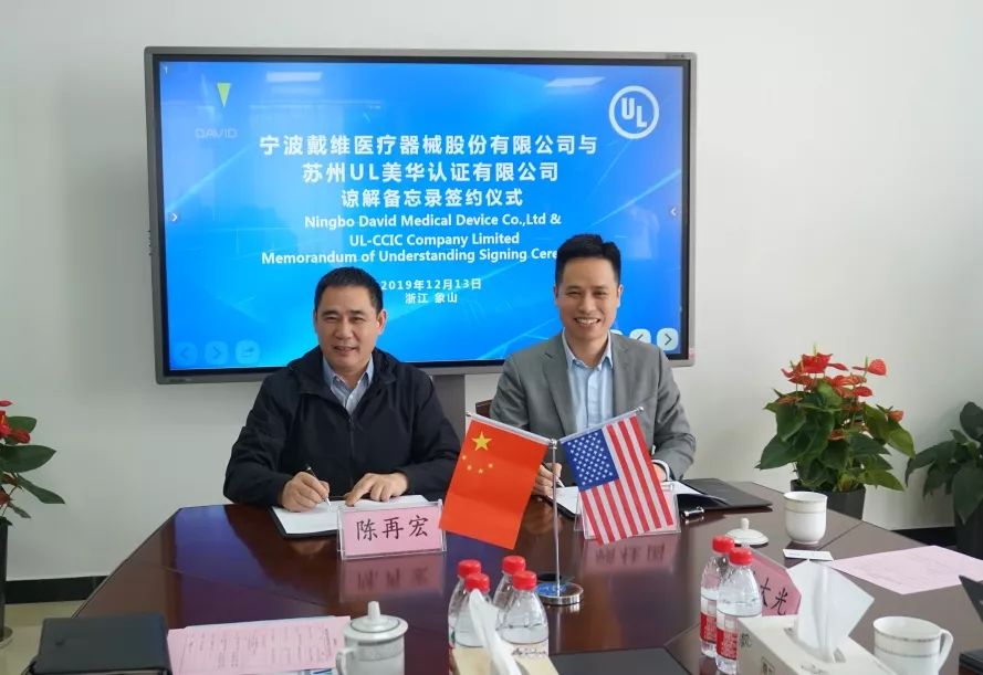 寧波戴維醫(yī)療器械股份有限公司總經(jīng)理陳再宏(左)與美國UL生命與健康科學(xué)部亞太區(qū)總經(jīng)理顧桂國(右)簽署合作諒解備忘錄